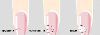 Некоторые мастера считают, что максимально надежно можно «обезвредить» трещину только если вырезать ее. Как это? – спросите вы. Для этого маникюрными ножничками делается надрез, перпендикулярно трещине так, чтобы ее следов в глубину ногтя вообще не осталось. Получается в свободном крае сбоку такая треугольная пустошь, которую далее требуется заполнить.