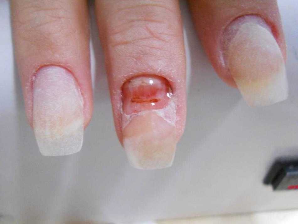 - снимается покрытие с поврежденного пальца (специальным средством для шеллака или биогелей);