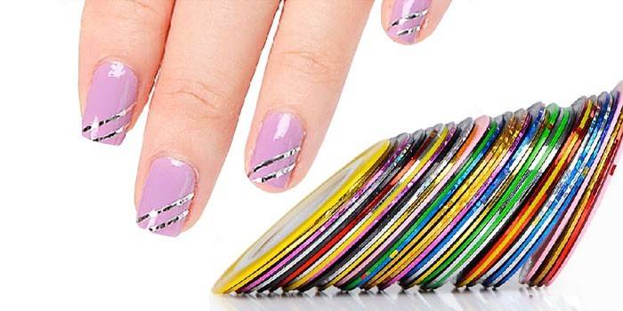 - Ленты. Бывают разных текстур (от тканевых до металлических) и цветов (однотонные, с рисунком, тканевым дизайном). Они тоже имеют липкую основу и наносятся на просохшее покрытие.