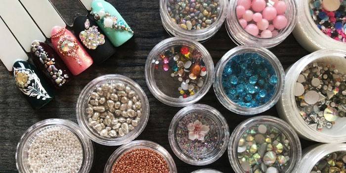 Бусины немного крупнее страз и будут заметно возвышаться над поверхностью ногтевой пластины. Профессиональные мастера используют их только для декора того маникюра, который будет носиться не дольше 7 дней. Крепятся бусины на акрил или топовое покрытие. В продаже есть и уменьшенная версия бусинок – бульонки. Они используются в дизайне «Икорный маникюр».