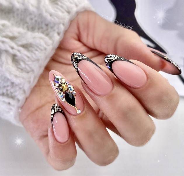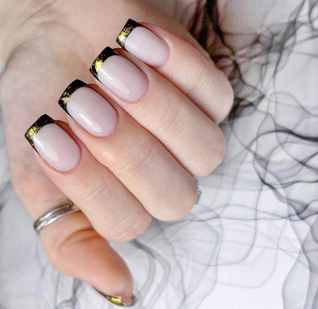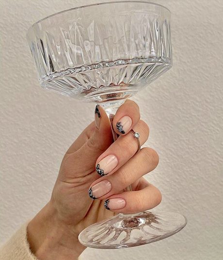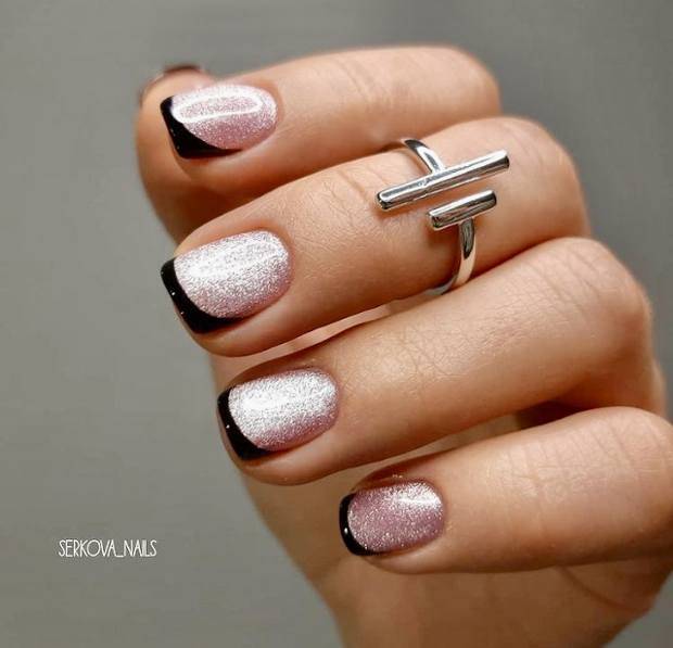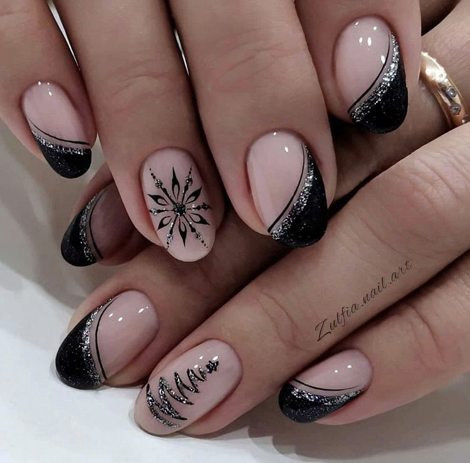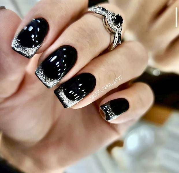 Черный маникюр в сочетании с французским является стильным и таинственным решением. Такой вариант отлично подходит практически под любой наряд. Ведь за время праздников можно успеть сменить несколько нарядов, а маникюр должен отлично сочетаться с каждым из них.