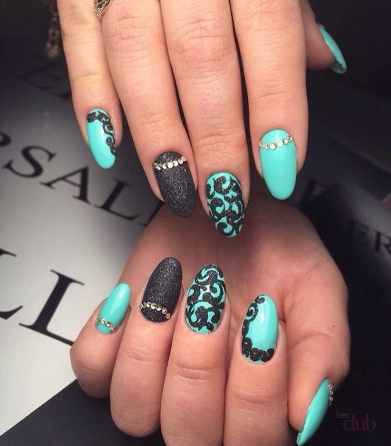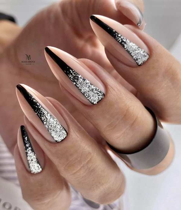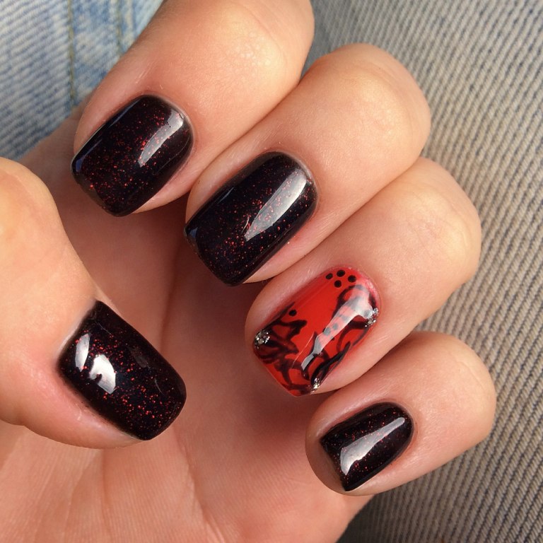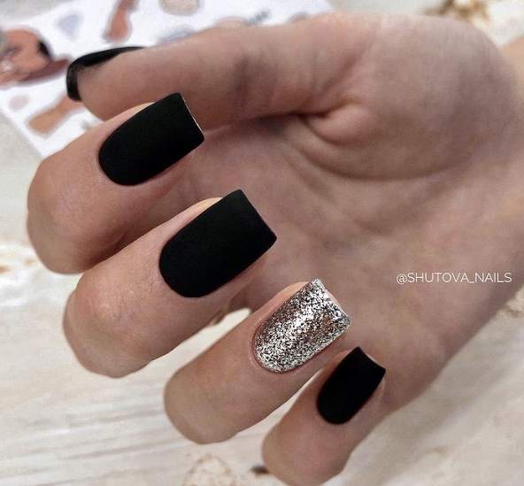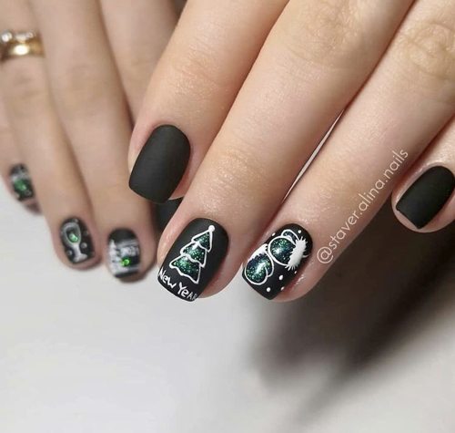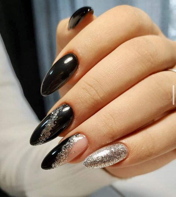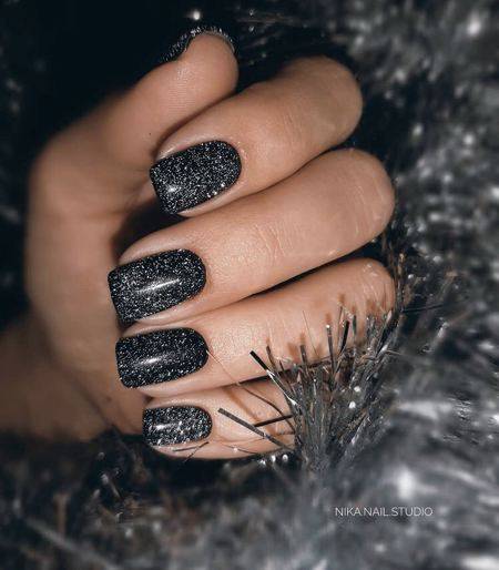 Для создания черного элегантного образа в новый год, в качестве дополнения к образу стоит сделать черный маникюр с блестками. Они делают дизайн интересным и праздничным. Черный фон используется для разных техник нейл-арта, к примеру для покрытия лаком кошачий глаз, чтобы цвет не плешивел и выглядел насыщенно.