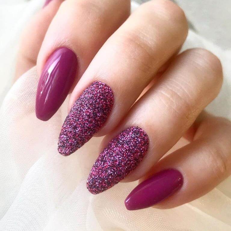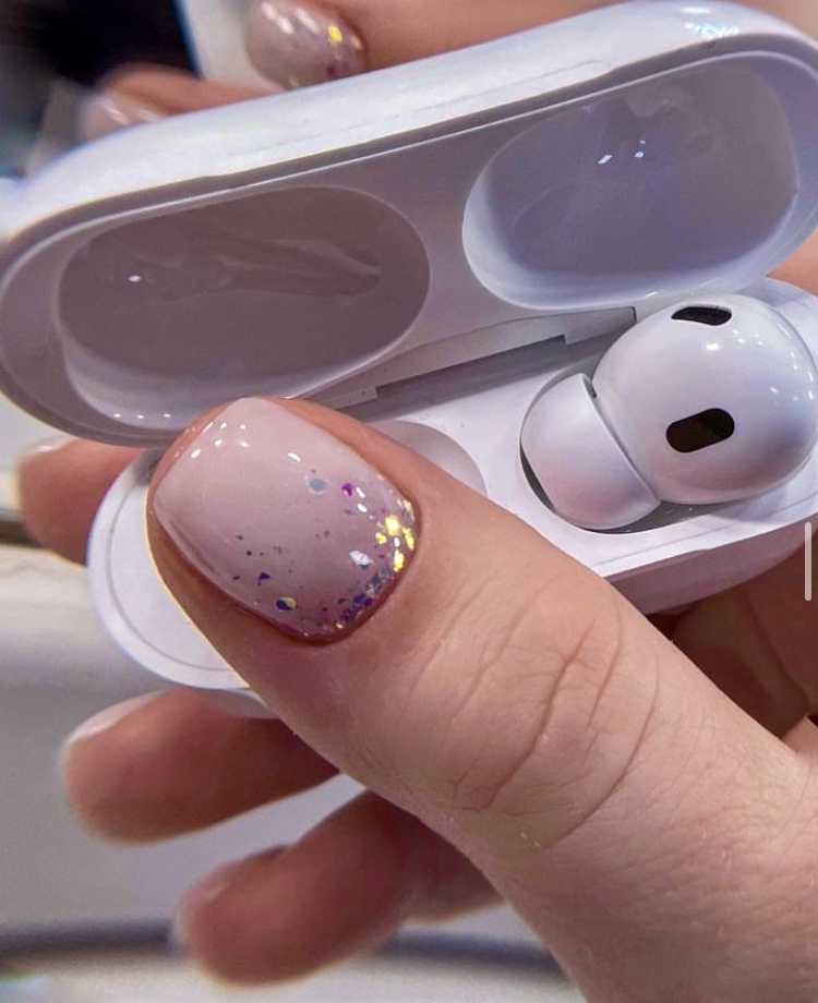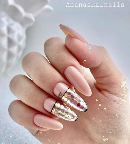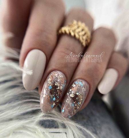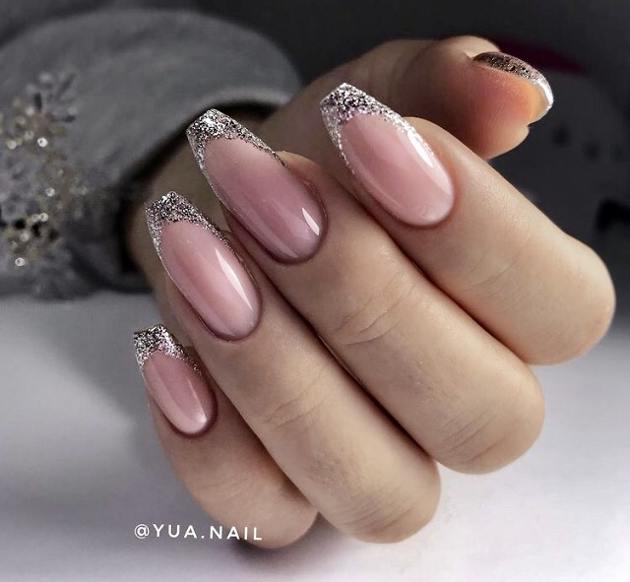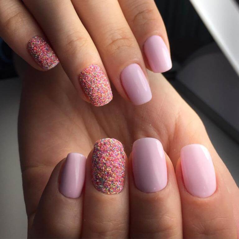 Такой маникюр ассоциируется с нежностью и воздушностью. Подходящим украшением однотонного покрытия ногтей станут блестящий глиттер и меланж. Получится эффект засахаренных ногтей.