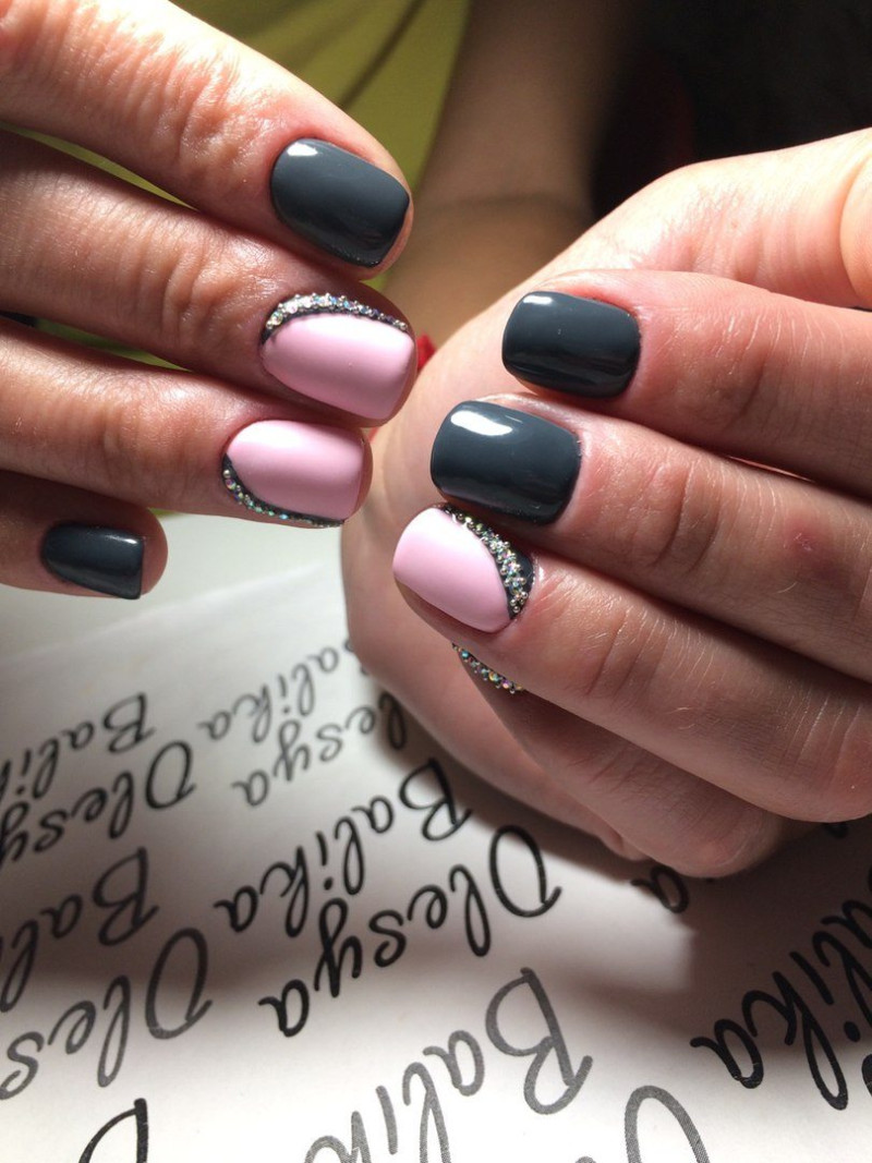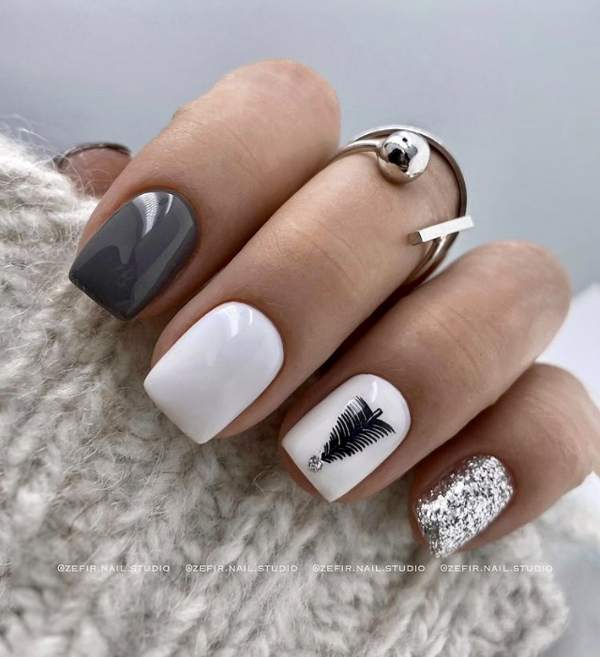 Некоторые люди считают, что серый безликий цвет и совершенно не подходит для новогоднего маникюра. На самом деле серый в сочетании с белым и серебристым позволяет создать сияющий и универсальный французский маникюр на Новый год. К тому же оттенки серого отлично сочетаются и с другими модными цветами лака.