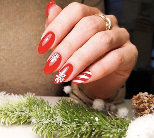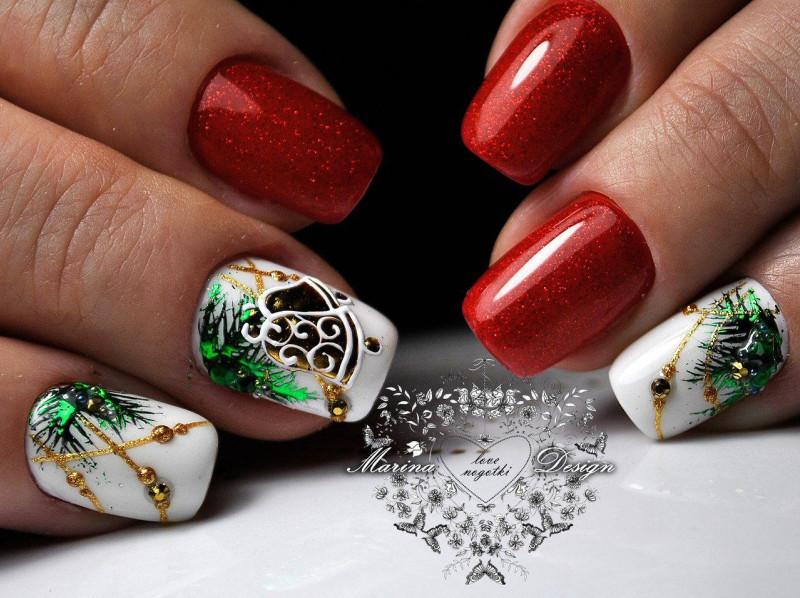 Сочетание красного и зеленого цвета в новогоднем дизайне – классическое решение. Красный сам по себе является базовым цветом для повседневного маникюра, но при сочетании с насыщенным зеленым цветом возникает ощущение праздника. Можно дополнить такой дизайн элементами серебристого и белого цвета.