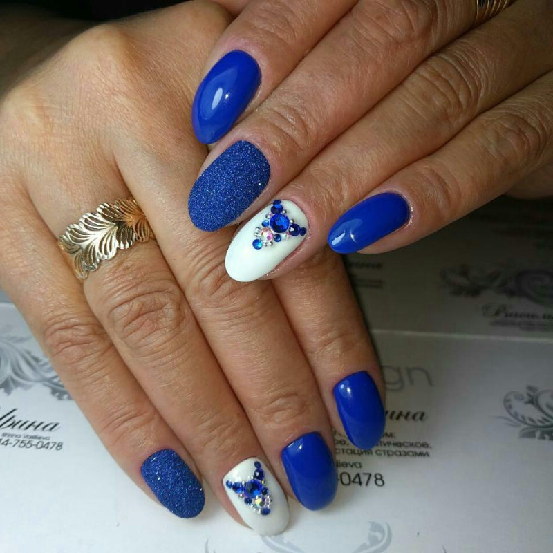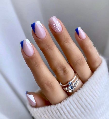 Палитра синего особенно актуальна в сезоне 2023-2024 годов. Для новогоднего френча лучше всего использовать насыщенно синий, цвет индиго и южная ночь. Данные оттенки лучше всего сочетаются с белым и серебристым цветом и ярким дизайном.