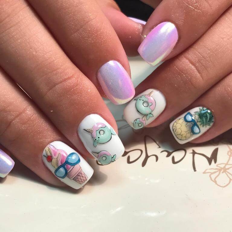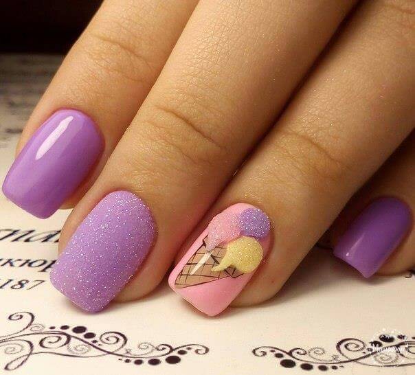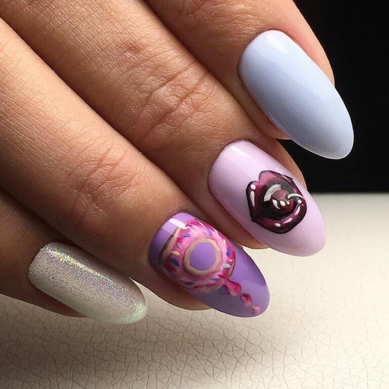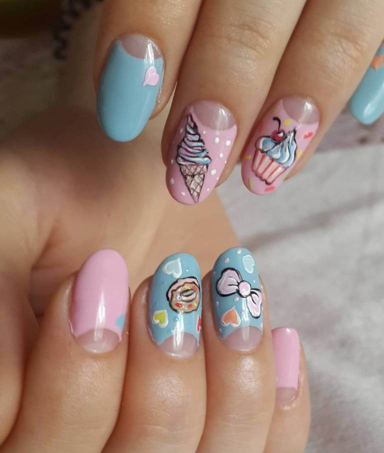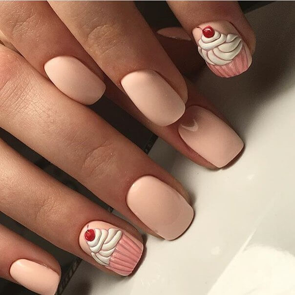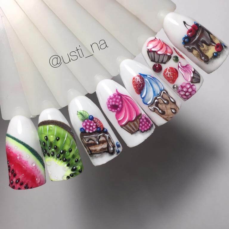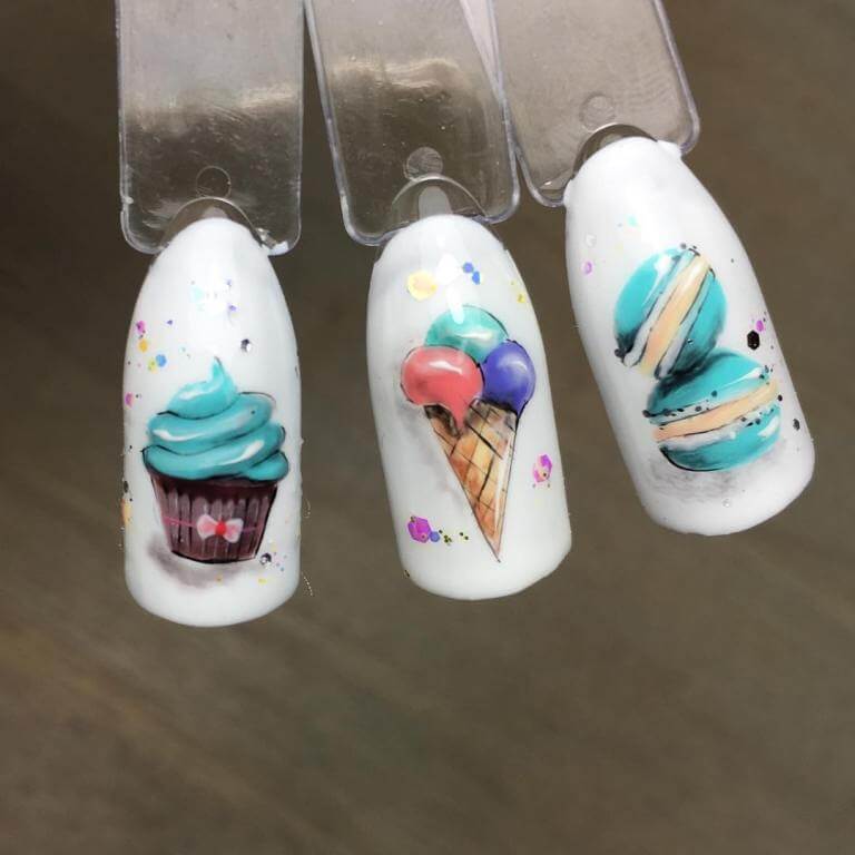 Не менее оригинальным дизайном по праву считается изображение на ногтях различных видов выпечки и освежающего мороженого. Подумайте, какой десерт доставляет вам наибольшее удовольствие. Так вы скорее определитесь с рисунком, потому что вариаций декора огромное количество.