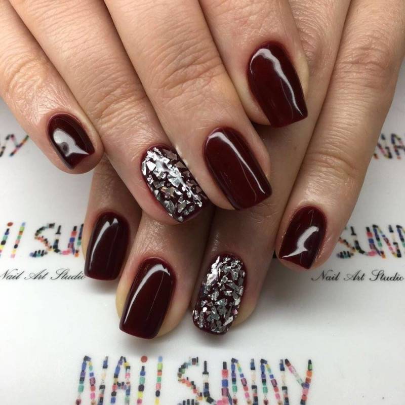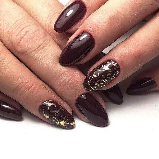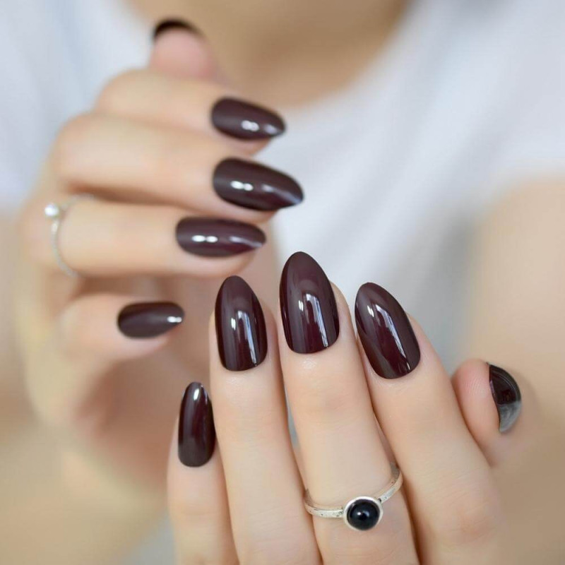 Очень эффектно выглядит на овальных или миндалевидных ноготках короткой длины тёмное покрытие. Это может быть лак чёрного, кофейного или же бордового цвета.