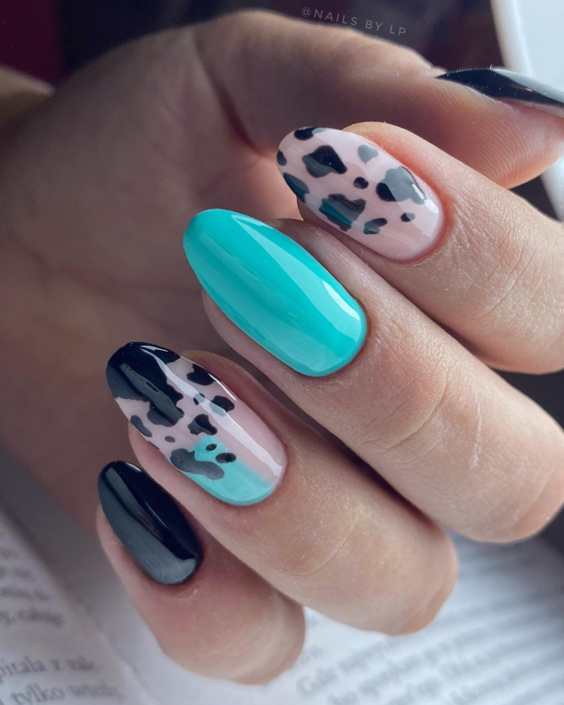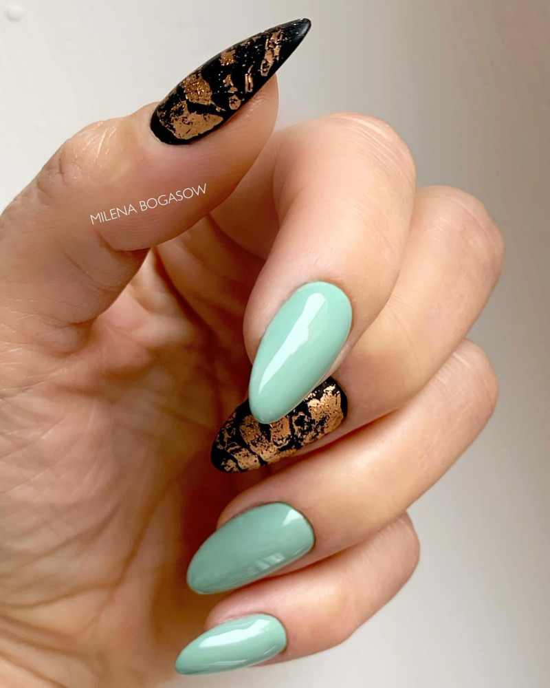 Желтый и мятный — это два лидирующих цвета летнего сезона 2024 года. По всей цветовой гамме они идеально перекликаются друг с другом создавая при это шедевральный результат. Добавьте несколько геометрических линий ярко желтого цвета или нарисуйте им цветок на благородном мятном фоне. Для тех, у кого нет времени и желания заморачиваться с дизайном, nail мастера предлагают добавить многогранности мятному маникюру, окрасив в желтый цвет один из ногтей.