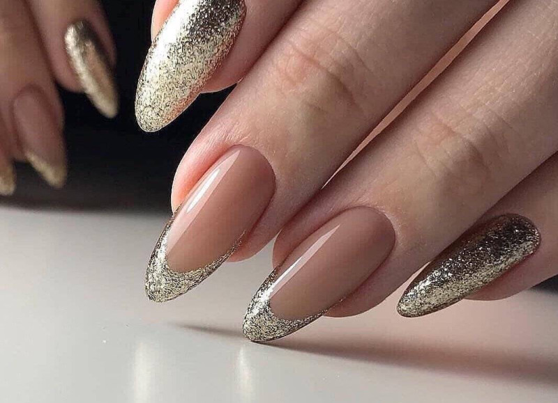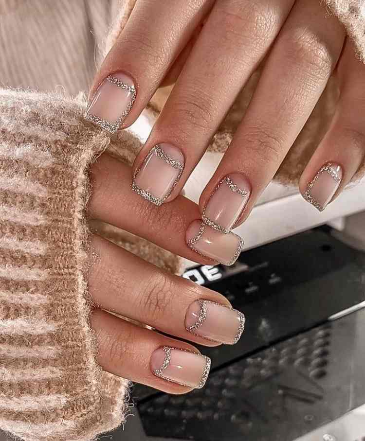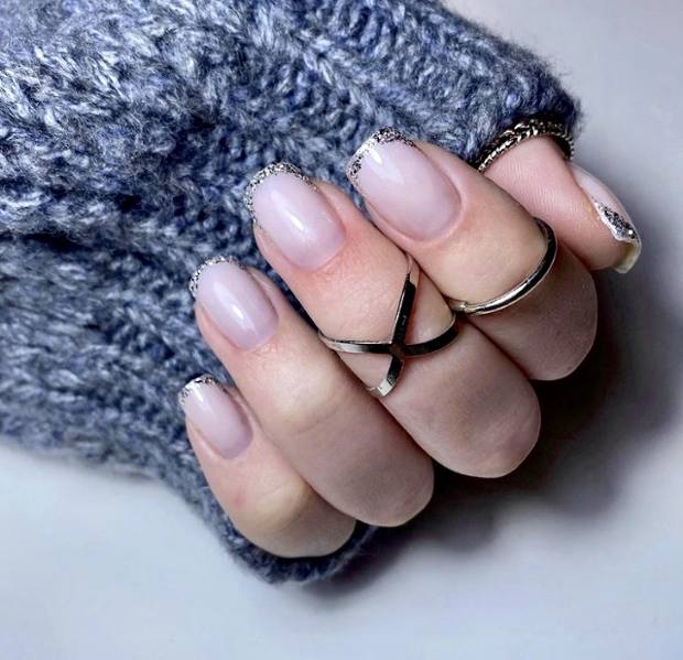 Не все девушки выбирают на Новый год очень яркий дизайн ногтей. Для наряда в светлых тонах подойдет нюдовый французский маникюр. Он может быть декорирован небольшим количеством блесток и страз, а улыбка может быть выполнена жидким металлом. К тому же сразу же после Нового года многим девушкам нужно выходить на работу, а слишком яркие цвета маникюра могут быть запрещены дресс-кодом компании. Поэтому нюдовый французский маникюр в таком случае станет отличным решением.