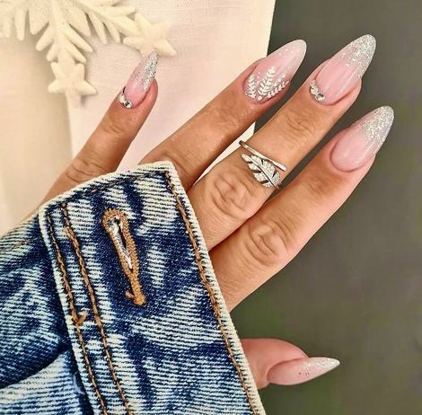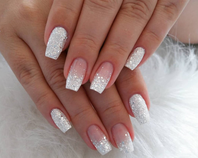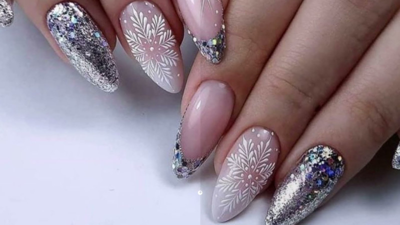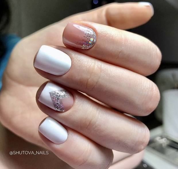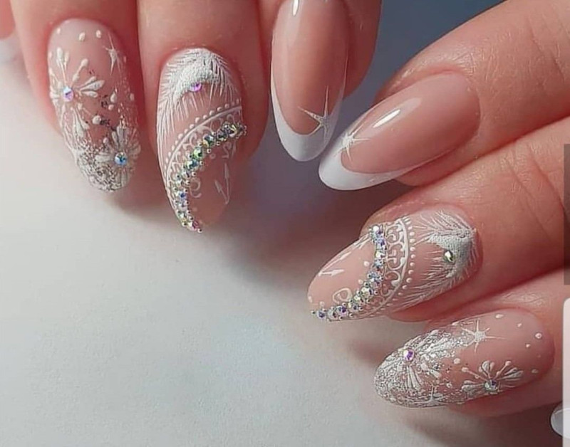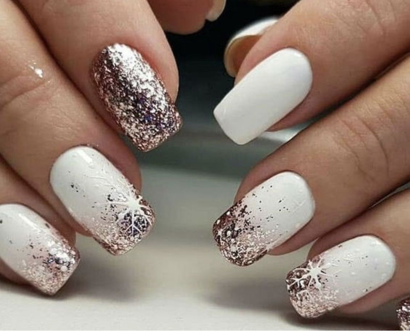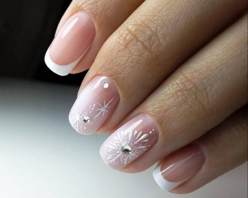 Нежно и модно смотрится классический белый нежный френч в сочетании с блестками и снежинками.