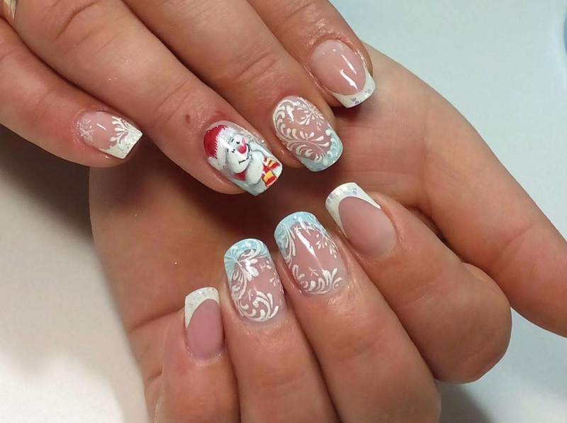 Если вы предпочитаете цветной французский маникюр, то для Нового года сочетайте зимние тона, например, молочный с голубым, кремовый с синим, чёрный с белым. Отличным дополнением станет добавление блёстков или шиммера.