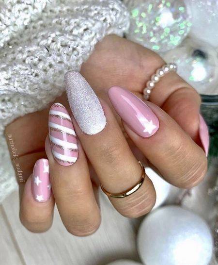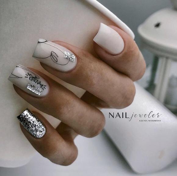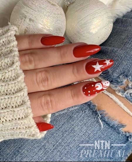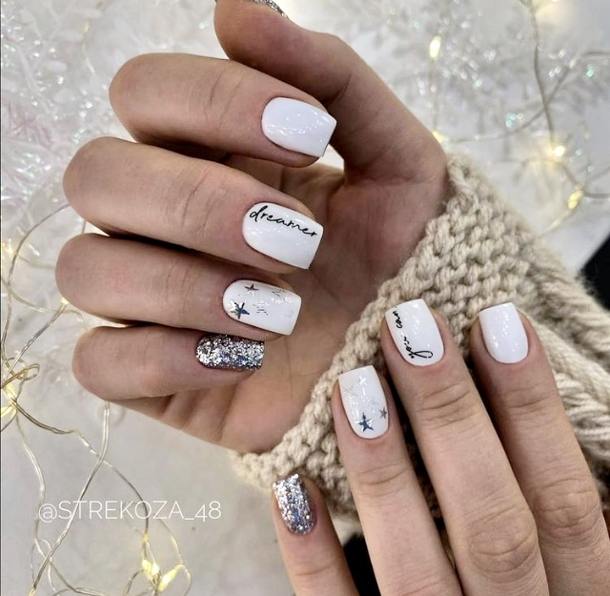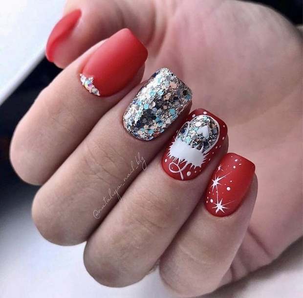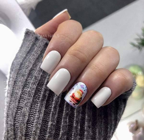 С ним в новогодний вечер все внимание окружающих будет сосредоточено на ваших ручках. Для эффектности и легкого декорирования можно не использовать рисунки, а просто украсить поверхность блестками в форме звездочек. Белоснежный маникюр хорошо выглядит на любой длине, особенно на средней