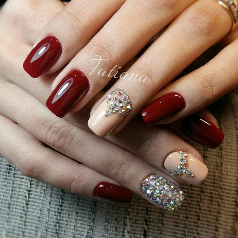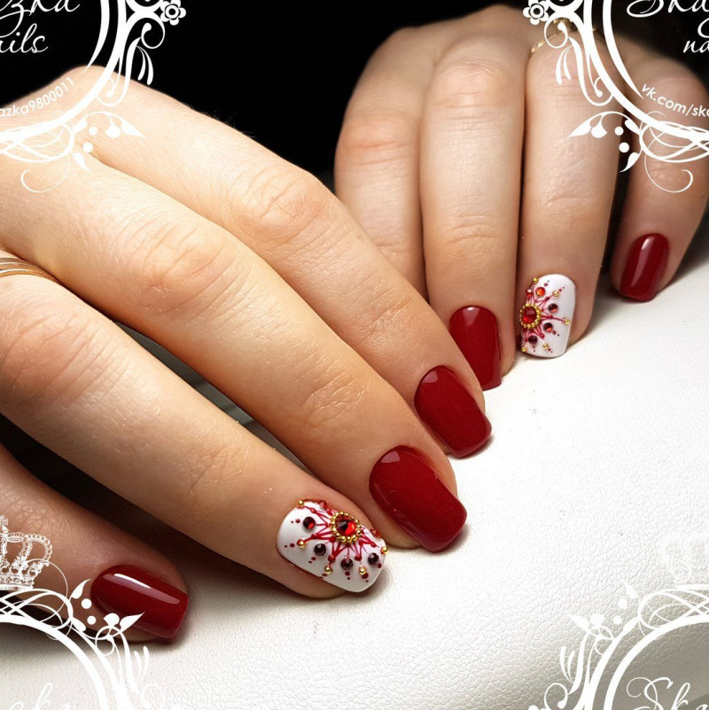 Самый нарядный цвет, который подойдет для любого мероприятия и будет выглядеть выигрышно – красный. Лучше использовать на длинные и острые ногти с фактурой: шиммер и перламутр. Для коротких ноготков можно украсить френч декором из красных конфетти, которые будут красиво переливаться на одном или нескольких пальчиках.