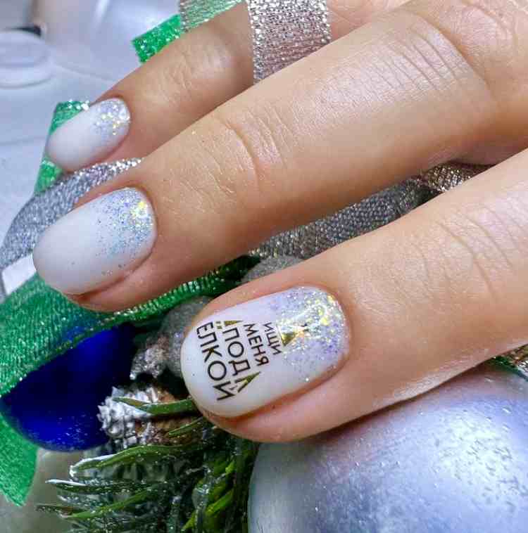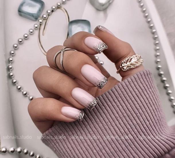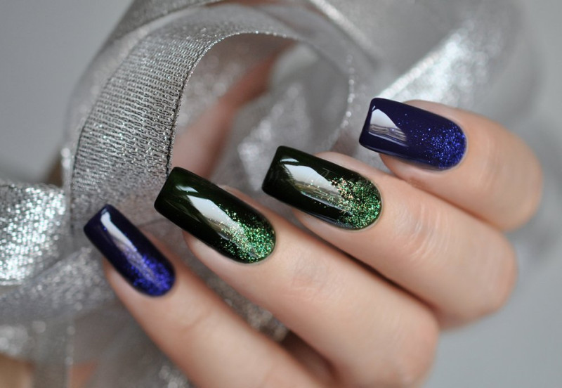 Если хочется красивых переходов на ноготках, то смело делайте градиент. Кроме того, в этом праздничном сезоне очень модно поверх цветного градиента, дополнительно делать легкую растяжку серебряными блестками. Это выглядит очень стильно и нарядно.