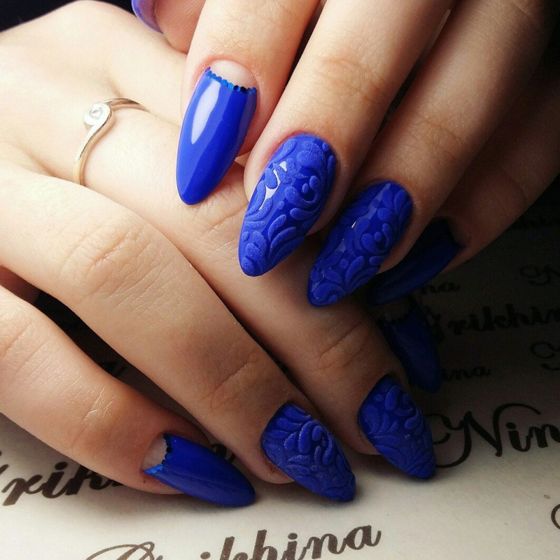 Второе место занимает яркий синий цвет, который символизирует зиму. Глубокий цвет привлекает большим выбором оттенков и фактур. Синий интересно гармонирует с втиркой или матовым топом