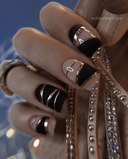 - Маникюр в чёрно-золотых тонах. Девушкам очень нравится модный нынче полулунный дизайн. Для новогоднего маникюра подойдёт чёрно-золотистая цветовая гамма. Так же красиво выглядит лунный маникюр, в котором лунка остаётся незакрашенной или же выложена блёстками золотого цвета на покрытии чёрного фона. Красиво смотрится луночка чёрного цвета с золотистым ноготком.