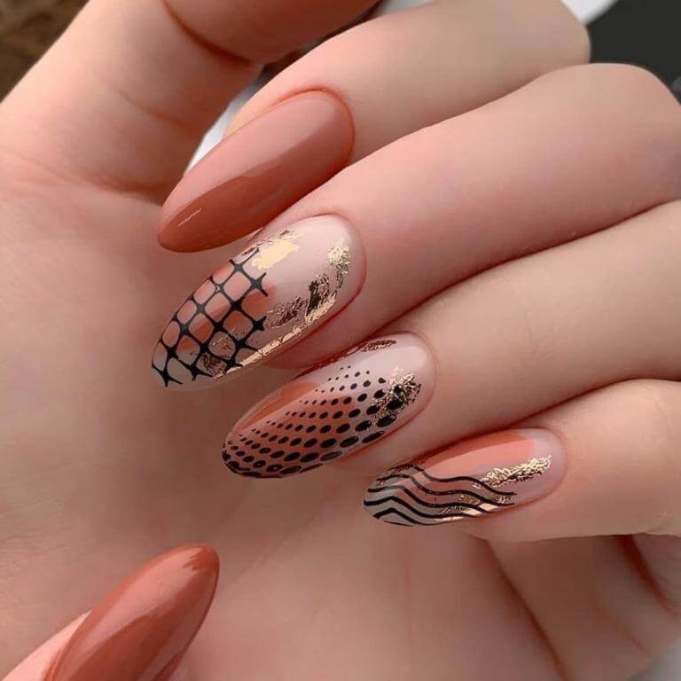 Самый смелый и эффектный цвет – золотой. Всегда смотрится круто, особенно в паре с песочными, нюдовыми и пастельными оттенками. Можно использовать его как основной фон под абстрактный или геометрический рисунок.