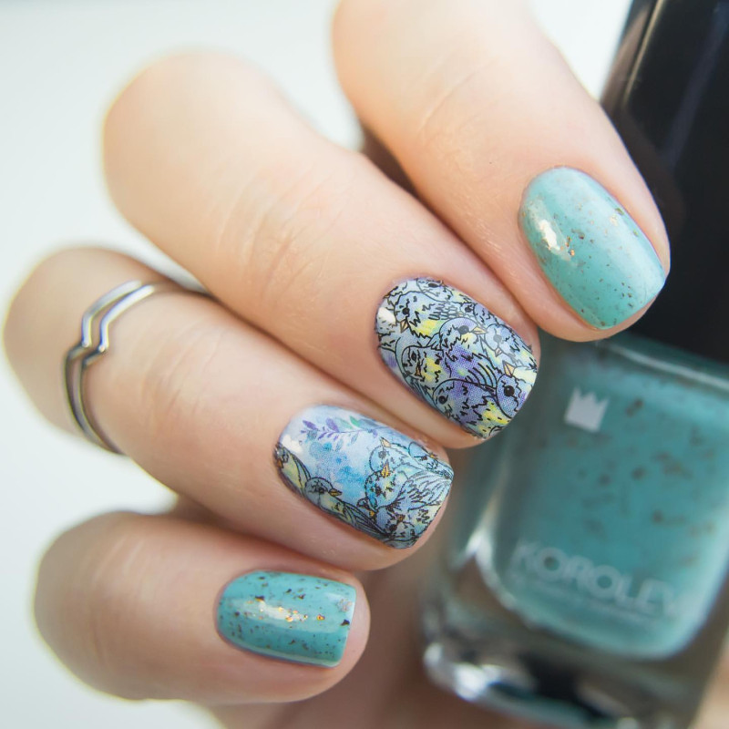 Если вы предпочитаете минималистичный дизайн — присмотритесь к маникюру, где изображение наносится лишь на несколько ногтей. Таким образом, шанс перегрузить композицию обилием элементов значительно снижается. Отличным дополнением станут блестки и глиттер.