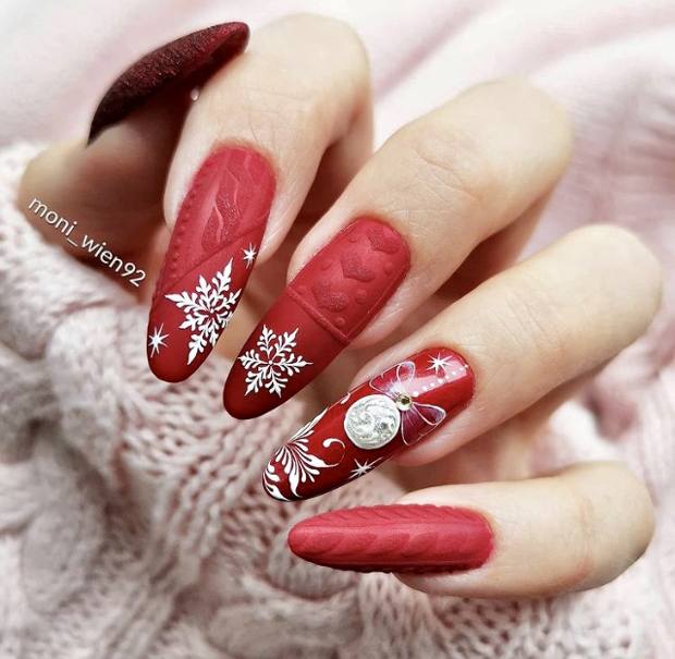 Очень мило и уютно будет смотреться вязаный дизайн. Причем сделать его можно как в нежных молочных или светло-бежевых оттенках, так и в яркой красной цветовой гамме. Дополнить его можно блестящими серебряными блестками, стразами и традиционными тематическими рисунками снежинок.