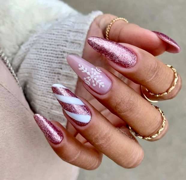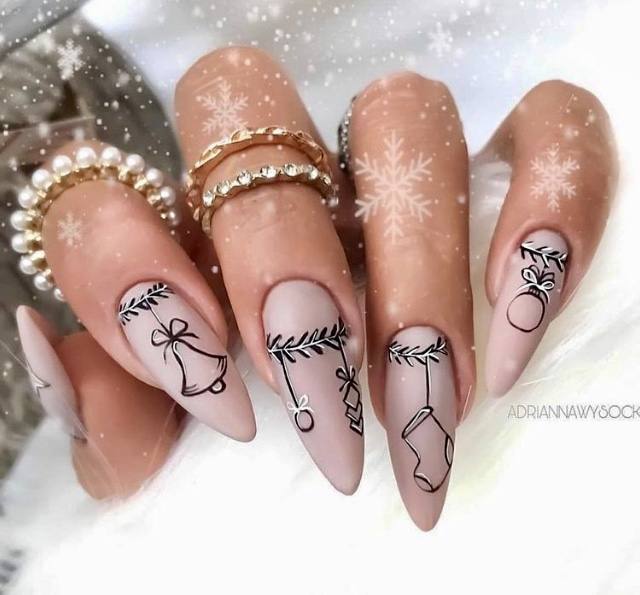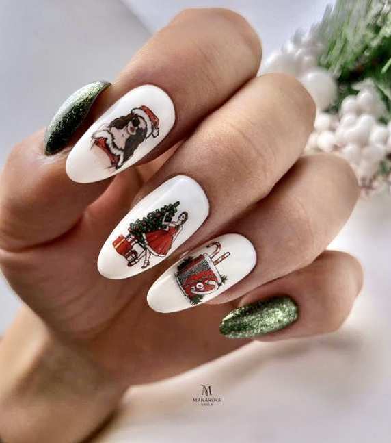 Как всегда хороши Санта-Клаусы, олени, цветущий рождественник, гирлянды и елки. Конфетти и серпантин, бенгальские огни добавят маникюру гламурного блеска.