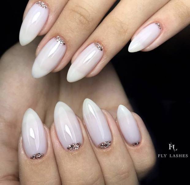 Белоснежный маникюр хорошо выглядит на любой длине, особенно на средней. Светлые ногти можно разбавить невесомым амбре с дымчатым или серым цветом. Белый цвет всегда входит в топы и никогда не выходит из моды.