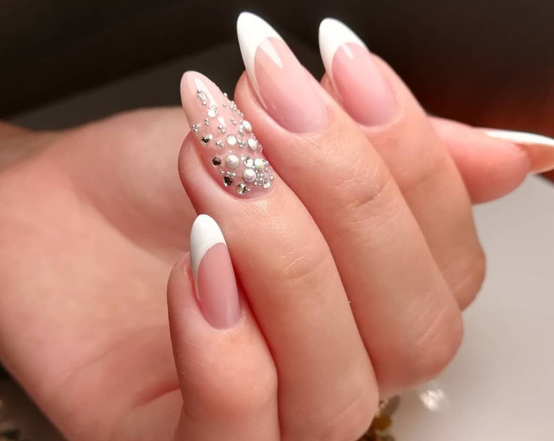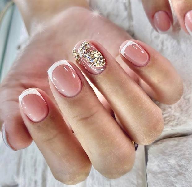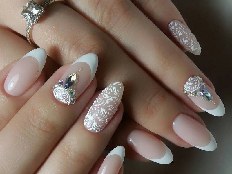 Изящно и нежно смотрится френч в сочетании с вензелями, блестками и стразами.