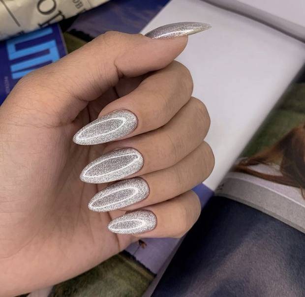 В этом сезоне особым трендом является дизайн ногтей Кошачий глаз в хрустальном, серебряном и золотом цвете. Посмотрите, как красиво он сияет. Можно сделать его в чистом виде, а можно добавить к нему тематические Новогодние рисунки снежинок.