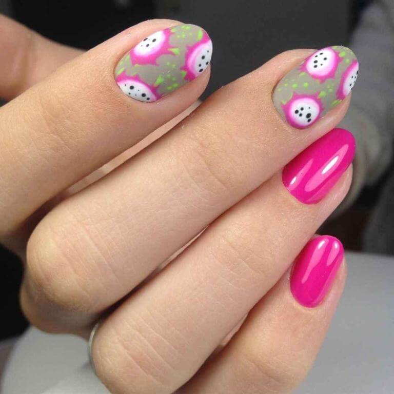 Если вдруг вы сейчас на диете и не хотите искушать себя сладким маникюром, фруктовый дизайн — идеальная альтернатива. Такое оформление ногтей дает отличную возможность проявить креативность. Маникюр получается очень ярким, он точно создаст летнее настроение холодной зимой.