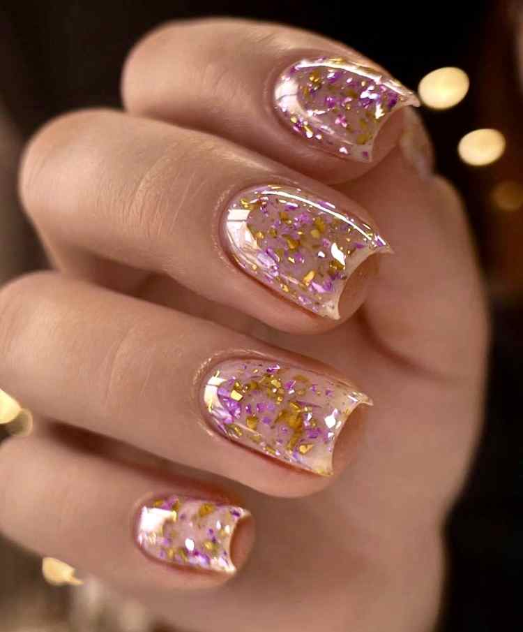 Фольга разных цветов очень стильно и нарядно будет смотреться в вашем Новогоднем дизайне. Ее можно сделать как самостоятельным дизайном, так и скомбинировать с френчем, мазками и брызгами краски, гелем «Паутинка» и любыми блестками.