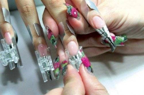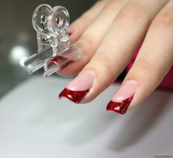 - Формы снимаются, ногти зажимаются специальными зажимами, с помощью которых мастер создает необходимый силуэт ногтя. Полимеризация осуществляется в течение 5 минут. Зажимы снимаются, с помощью пилочки придается форма.