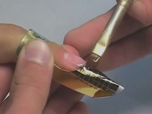 — Форма шаблона вырезается по форме натуральной ногтевой пластины, после чего устанавливается на ноготь без малейшего зазора, в противном случае туда может забиться гель, что отрицательно повлияет на качество работы.