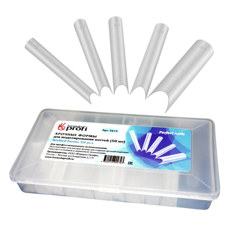 - Многоразовые пластиковые формы для создания арочной подложки. Работают как в гелевой, так и в акриловой технологии. Если клиенты имеют склонность грызть ногти даже до такого состояния, что из-под ногтя выглядывает торцевая подушка, то под такие ногти очень сложно подставить бумажную форму. Также в случае если у клиента есть травмированные ногти или которые растут вниз. Для всех этих случаев лучше подходит этот способ. Процесс напоминает установку классических типс, поэтому он проще в выполнении.