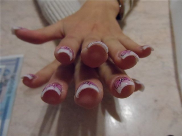 - Липкий слой геля удаляется, пилочкой отпиливается линия улыбки. На свободный слой формы наносится тонкий слой базового геля, после минутной полимеризации белым гелем выкладывается френч. Каждый ноготь высушивается в течение 2 минут.