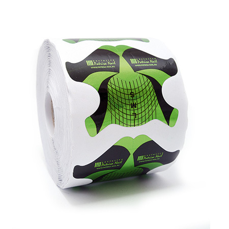 - Бумажные формы с разметкой и клейкой основой по краям. Такие формы подставляются под свободный край ногтевой пластины, и на поверхность по разметочным линиям выкладывается гель. Это достаточно сложный процесс и требует сноровки от мастера. Форму подрезают ножницами так, чтобы она смогла установиться на ногтевую пластину без зазоров. Это позволит предотвратить попадания остатков геля на кожу. Недостатком бумажных форм является то, что они могут расклеиться во время работы с ними. А также клиент может так положить руку в лампу, что сама формочка деформируется. И после того как заполяризовался материал, мы можем увидеть, что ноготь искривился.