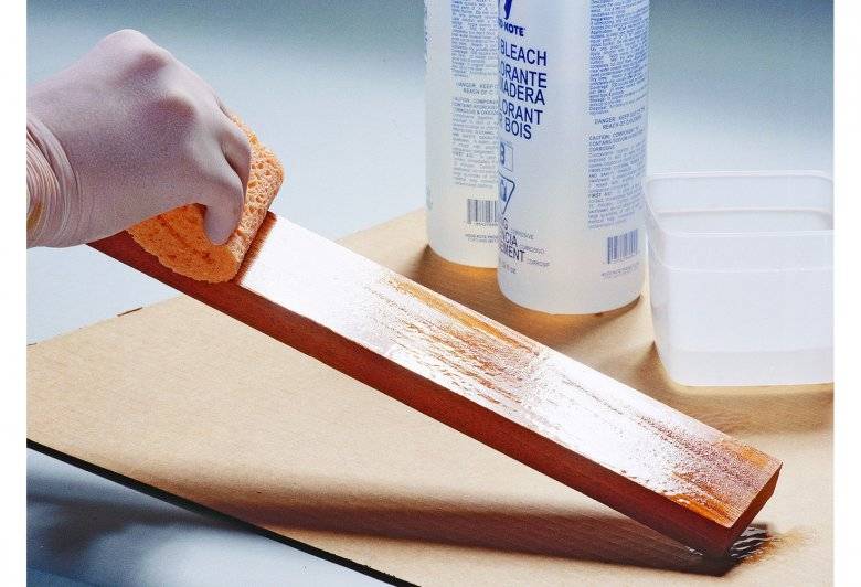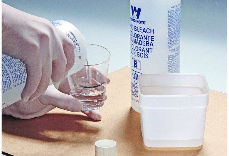 Рассмотрим пример использования отбеливателя марки Wood-Kote, который поставляется в двух бутылках. Для его использования необходимо смешать в равных частях две жидкости в стеклянном или пластиковом контейнере. Никогда не помещайте отбеливатель в металлическую емкость.