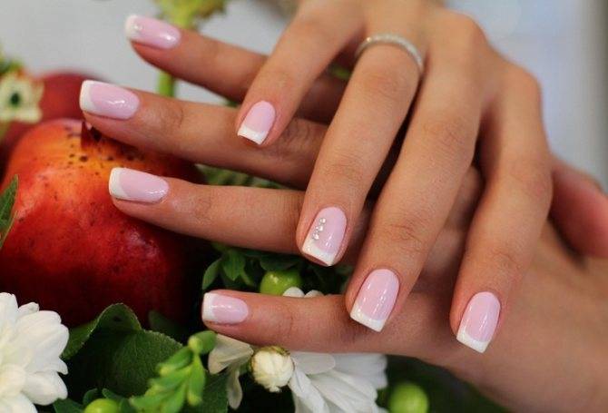 светло-розовых ногтя. Первый ноготь имеет белый базовый лак с тонкими