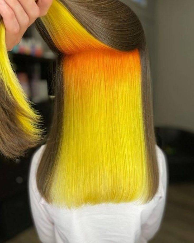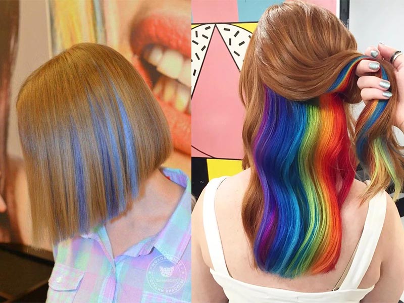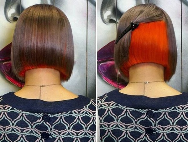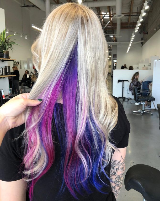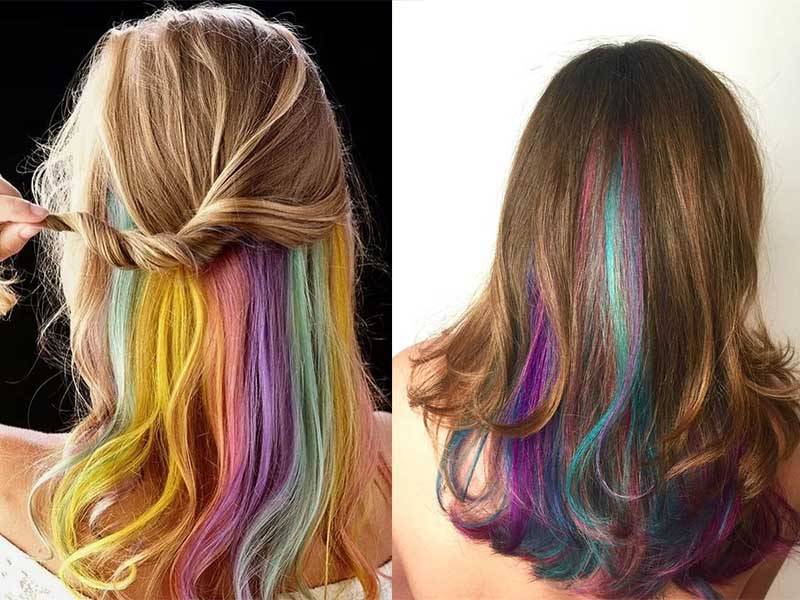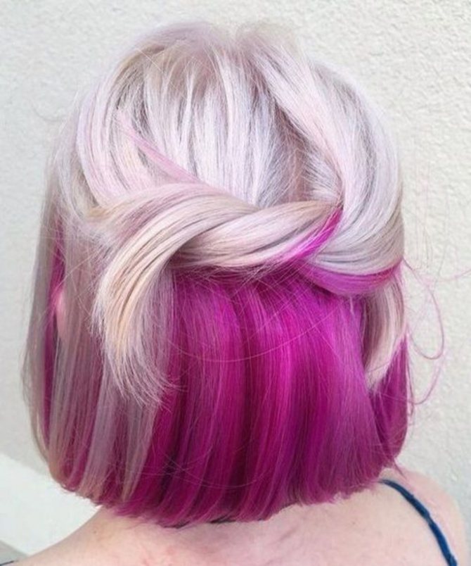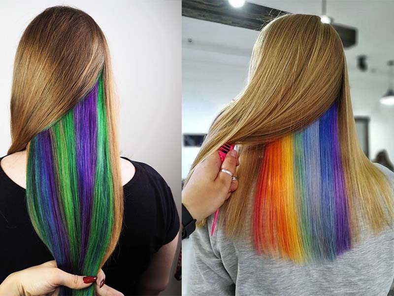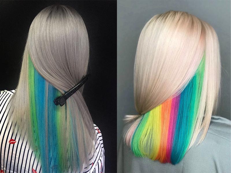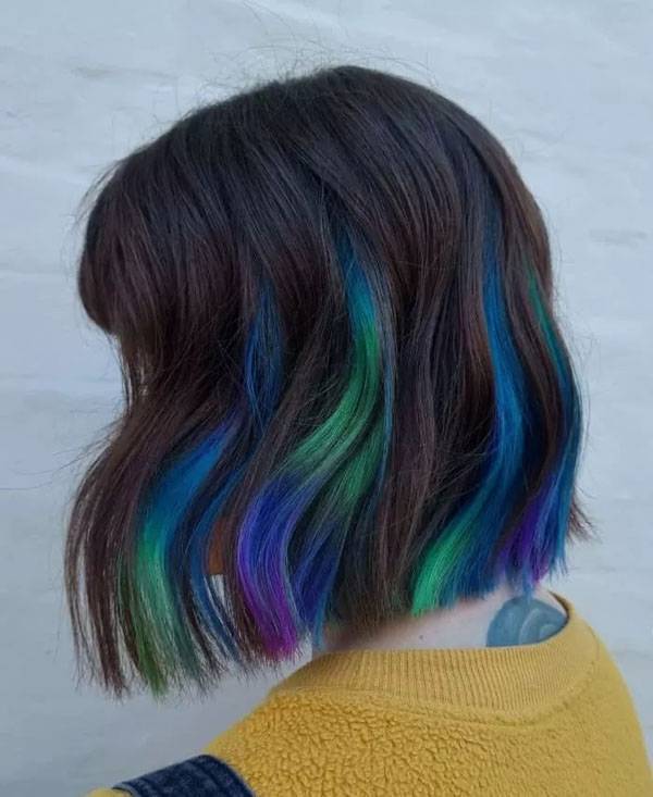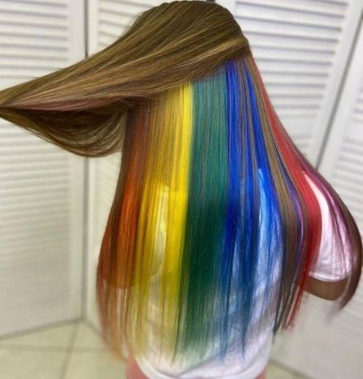 Волосы на затылке, под частью волос натурального оттенка делят на пряди и окрашивают в разные цвета. Можно выкрасить локоны в 2-3 контрастных оттенка или намного больше использовать цветов. Чем больше будет различных оттенков под натуральными волосами, тем больший фурор можно произвести. Все зависит от профессионализма мастера.