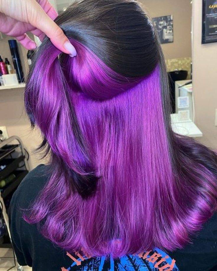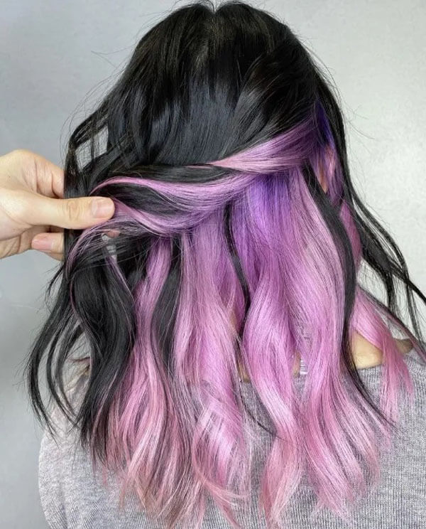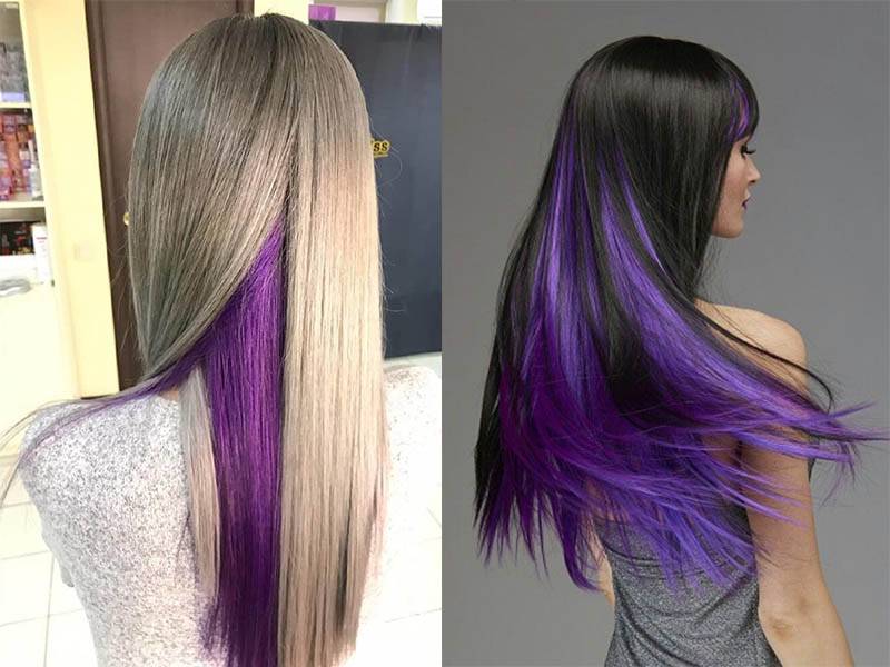 Для блондинок подойдут пастельные оттенки фиолетового – цвет сирени и лаванды, а для брюнеток лучше выбирать яркие неоновые фиолетовые оттенки, иначе цветное окрашивание под волосами не будет заметно.