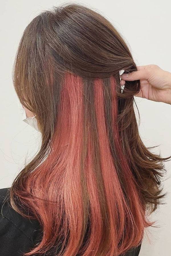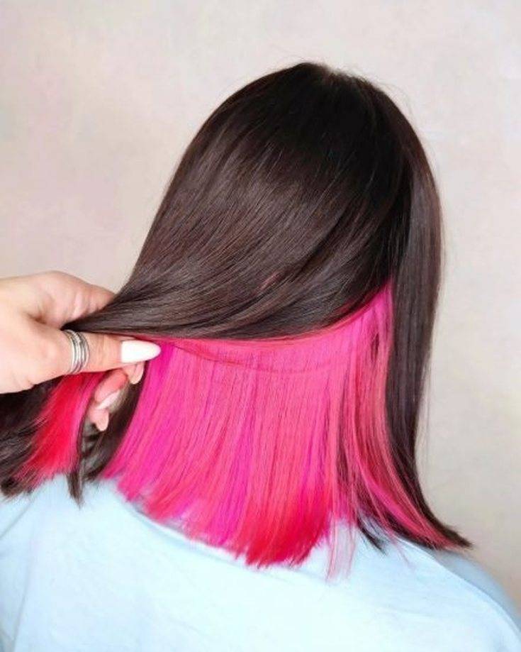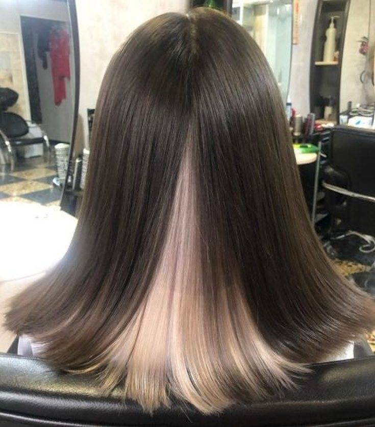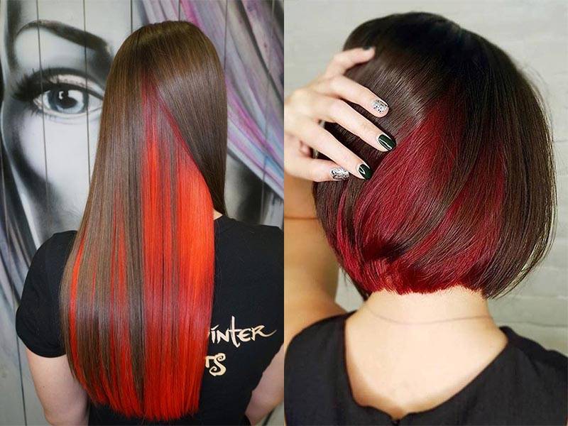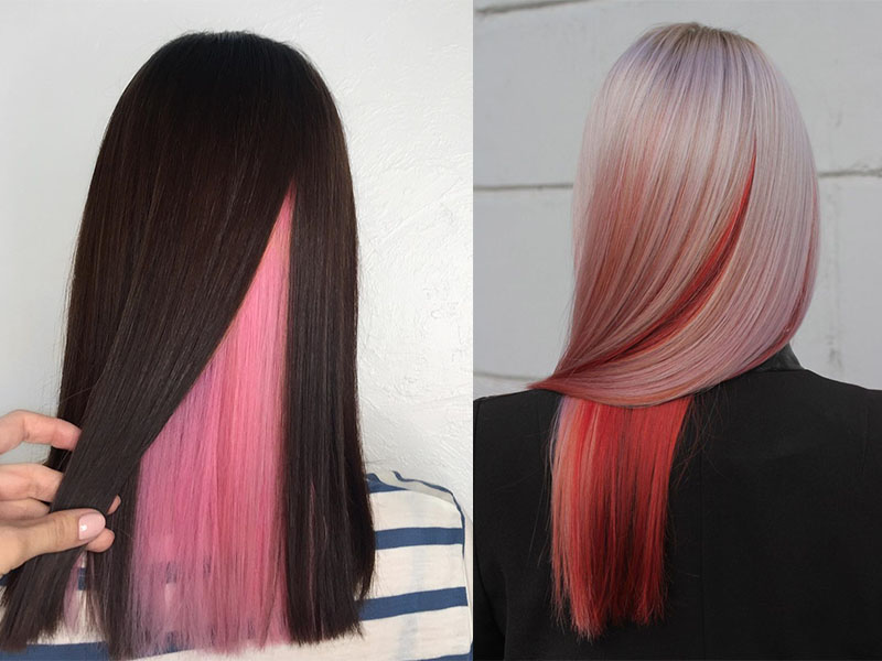 Девушкам с длиной волос до плеч и ниже скрытое окрашивание предоставляет больше возможностей. Цветом можно обозначить прядки от корней до кончиков. Цветной секрет открывается, только если волосы собраны в пучок или хвост.