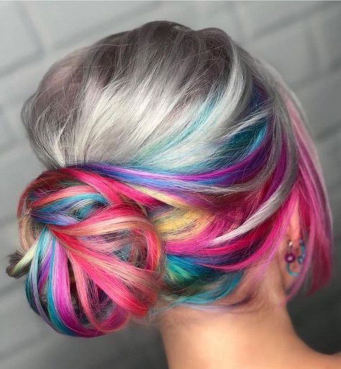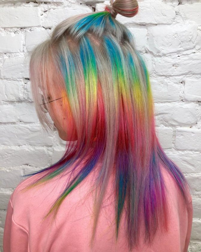 На затылке основная масса волос разделяется на пряди. Они окрашиваются в самые разные цвета. Можно выбрать 2-3 ярких тона для покраски или использовать гораздо больше тонов, к примеру, радужные цвета.