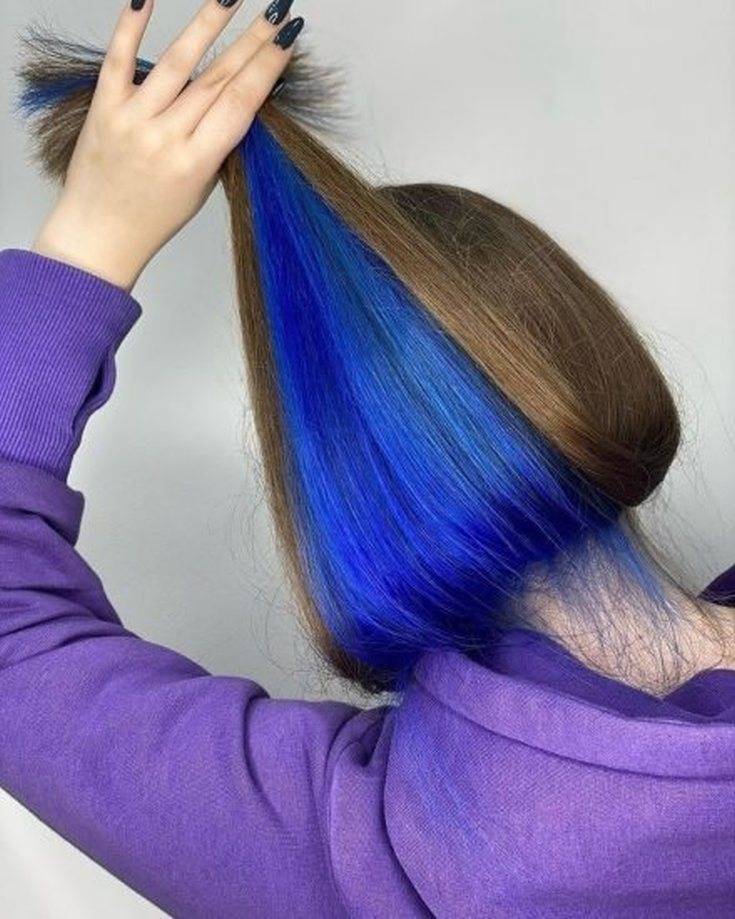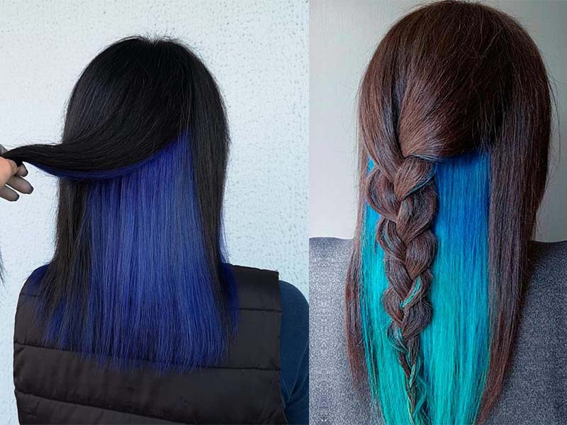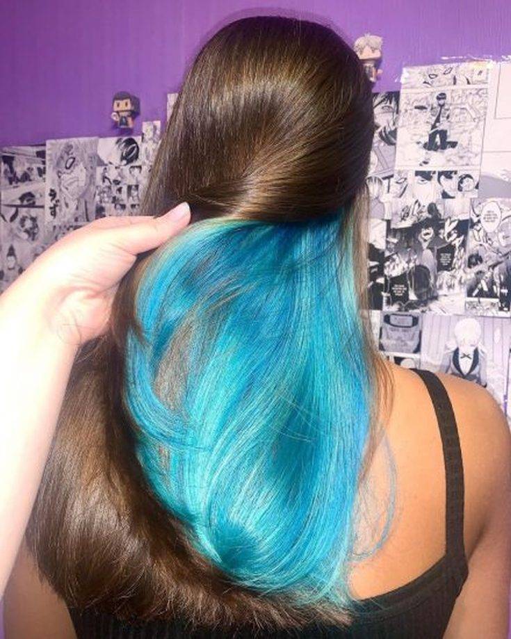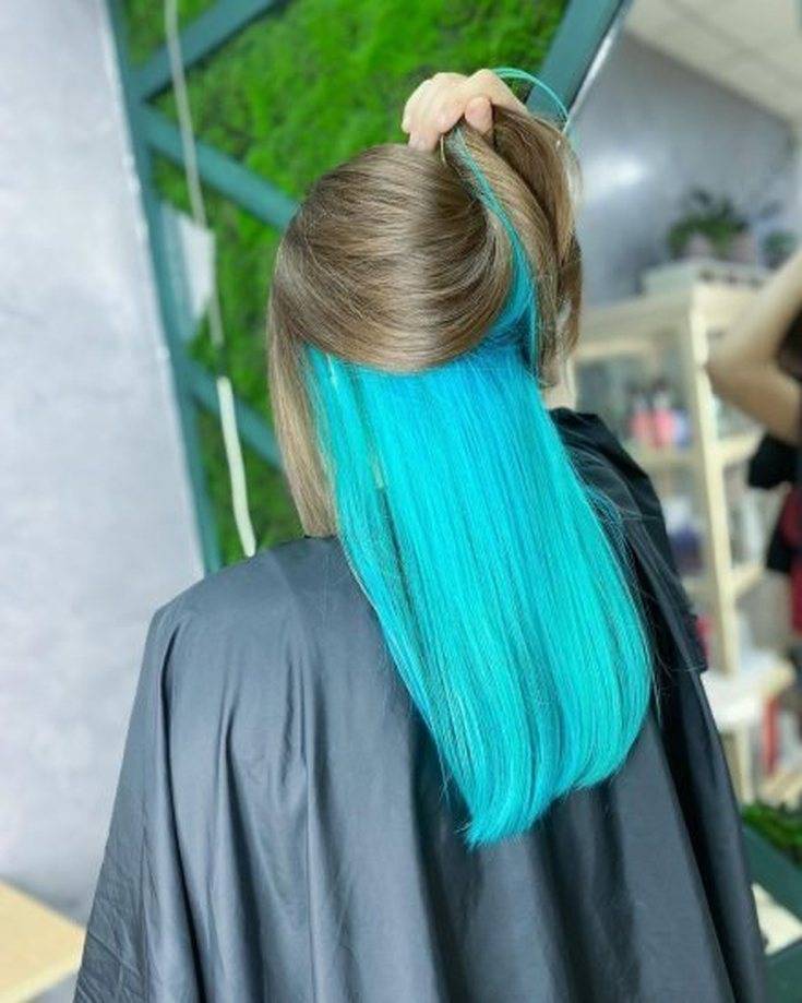Нежно-голубой тон — еще один фаворит у поклонниц потайного окрашивания. Мягкий пастельный оттенок замечательно смотрится в гуще светлых волос. Насыщенный голубой неон станет дерзким и ярим решением для шатенок и брюнеток.