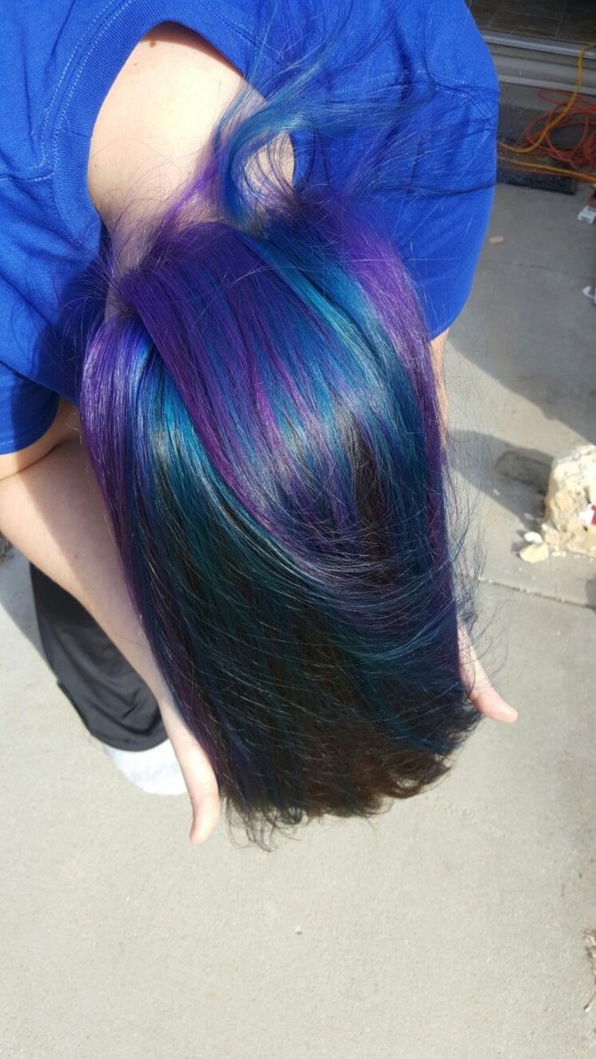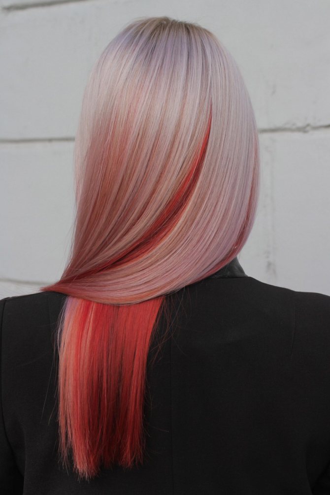Волосы на затылке, под частью волос натурального оттенка, делятся на пряди и окрашиваются в разные цвета. Можно выкрасить локоны, как в 2-3 контрастных оттенка, так и намного больше использовать цветов. Ведь чем больше будет различных оттенков у вас под натуральными волосами, тем больший фурор вы произведете. Все зависит от профессионализма мастера.