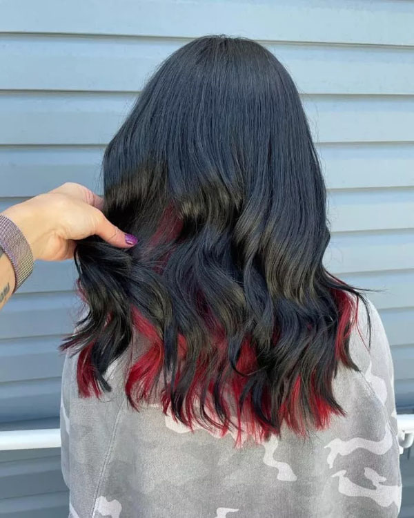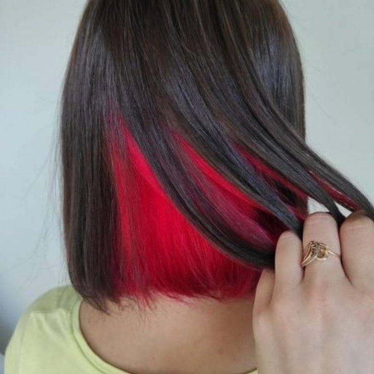 Практически все оттенки этого цвета хорошо подходят брюнеткам и шатенкам. Винные, алые и вишневые тона придадут тёмным волосам благородная сияние. Экспериментировать с красным могут и блондинки, но при условии, что их волосы достаточно густые. Сквозь тонкие и редкие пряди скрытый ярко-красный тон будет просматриваться и эффекта «скрытности» не получится.