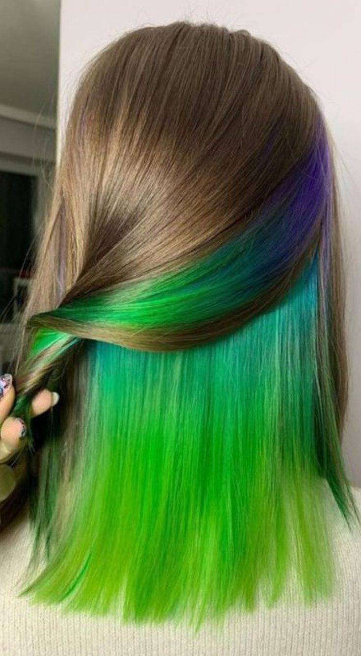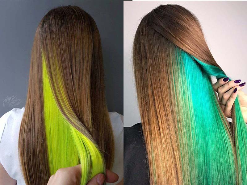 Для скрытого окрашивания лучше использовать броские и яркие тона — в этом весь смысл техники. Палитра оттенков широка, и выбрать цвет — не всегда лёгкая задача.