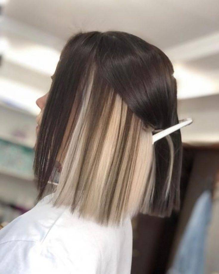 В экспериментах со скрытым блондом важно не перестараться. Нескольких светлых прядей будет достаточно. Иначе контраст будет слишком бросаться в глаза, и выглядеть неестественно