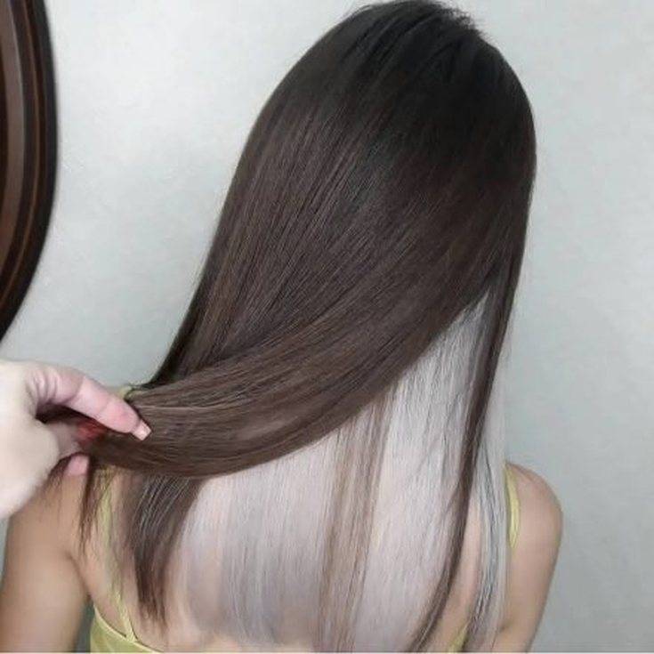 Перед тем, как сделать скрытое окрашивание на длинных темных волосах или волосах средней длины, им необходимо сделать осветление, иначе яркие пряди не получатся.