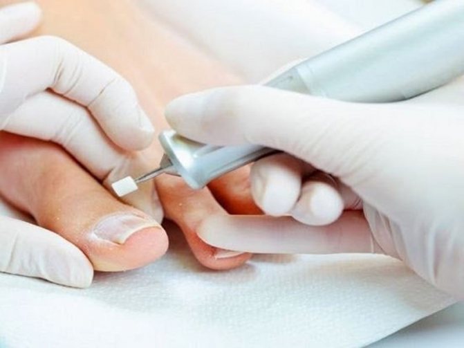 - После выбора насадки на прибор, врач обрабатывает всю поверхность ступни и зону вокруг ногтей, удаляя старую кожу и отшлифовывая эпидермис.