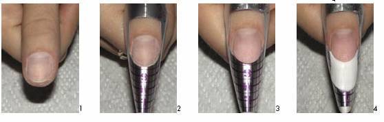 - Накладывают гель или акрил, придавая нужную форму по шаблону.