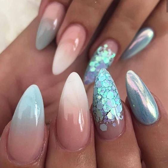 - Блестящий. Как таковой игры цветов здесь нет, используется только один лак. К нему добавляются блестки, количество которых будет уменьшаться ближе к границе перехода.